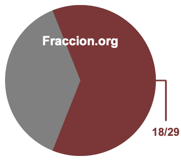 Aquí le mostramos un gráfico circular de 18/29. Para crear un gráfico circular que le muestra cuánto es 18/29, primero dividimos el círculo en cinco partes iguales. Entonces coloreamos 18 de las 29 partes en marrón oscuro. Aquí está el resultado: