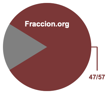 Aquí le mostramos un gráfico circular de 47/57. Para crear un gráfico circular que le muestra cuánto es 47/57, primero dividimos el círculo en cinco partes iguales. Entonces coloreamos 47 de las 57 partes en marrón oscuro. Aquí está el resultado: