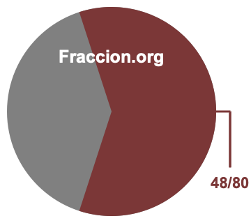 Aquí le mostramos un gráfico circular de 48/80. Para crear un gráfico circular que le muestra cuánto es 48/80, primero dividimos el círculo en cinco partes iguales. Entonces coloreamos 48 de las 80 partes en marrón oscuro. Aquí está el resultado: