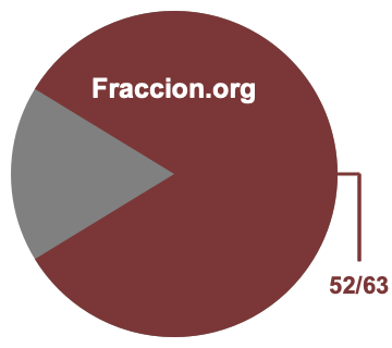 Aquí le mostramos un gráfico circular de 52/63. Para crear un gráfico circular que le muestra cuánto es 52/63, primero dividimos el círculo en cinco partes iguales. Entonces coloreamos 52 de las 63 partes en marrón oscuro. Aquí está el resultado: