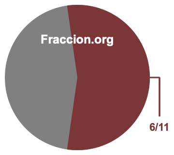 Aquí le mostramos un gráfico circular de 6/11. Para crear un gráfico circular que le muestra cuánto es 6/11, primero dividimos el círculo en cinco partes iguales. Entonces coloreamos 6 de las 11 partes en marrón oscuro. Aquí está el resultado: