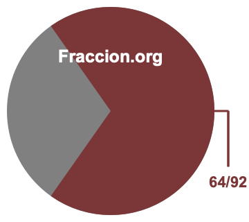 Aquí le mostramos un gráfico circular de 64/92. Para crear un gráfico circular que le muestra cuánto es 64/92, primero dividimos el círculo en cinco partes iguales. Entonces coloreamos 64 de las 92 partes en marrón oscuro. Aquí está el resultado: