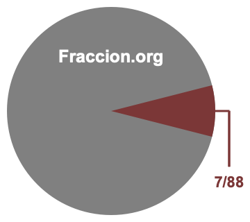 Aquí le mostramos un gráfico circular de 7/88. Para crear un gráfico circular que le muestra cuánto es 7/88, primero dividimos el círculo en cinco partes iguales. Entonces coloreamos 7 de las 88 partes en marrón oscuro. Aquí está el resultado: