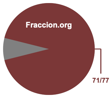 Aquí le mostramos un gráfico circular de 71/77. Para crear un gráfico circular que le muestra cuánto es 71/77, primero dividimos el círculo en cinco partes iguales. Entonces coloreamos 71 de las 77 partes en marrón oscuro. Aquí está el resultado: