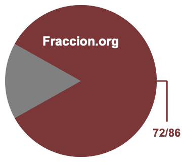 Aquí le mostramos un gráfico circular de 72/86. Para crear un gráfico circular que le muestra cuánto es 72/86, primero dividimos el círculo en cinco partes iguales. Entonces coloreamos 72 de las 86 partes en marrón oscuro. Aquí está el resultado: