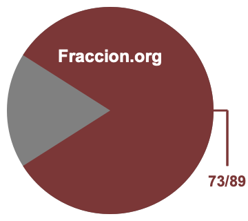 Aquí le mostramos un gráfico circular de 73/89. Para crear un gráfico circular que le muestra cuánto es 73/89, primero dividimos el círculo en cinco partes iguales. Entonces coloreamos 73 de las 89 partes en marrón oscuro. Aquí está el resultado: