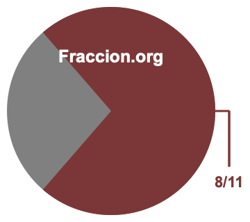 Aquí le mostramos un gráfico circular de 8/11. Para crear un gráfico circular que le muestra cuánto es 8/11, primero dividimos el círculo en cinco partes iguales. Entonces coloreamos 8 de las 11 partes en marrón oscuro. Aquí está el resultado: