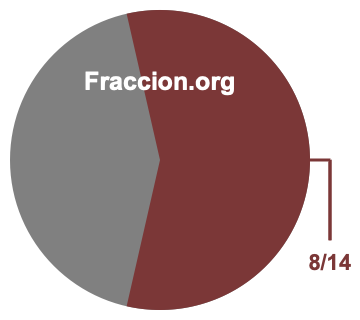 Aquí le mostramos un gráfico circular de 8/14. Para crear un gráfico circular que le muestra cuánto es 8/14, primero dividimos el círculo en cinco partes iguales. Entonces coloreamos 8 de las 14 partes en marrón oscuro. Aquí está el resultado: