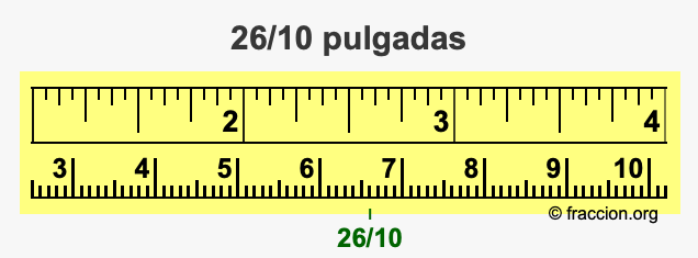 ¿Cómo convertimos 26/10 pulgadas a centímetros (cm)? ¿Cuánto es 26/10 pulgadas en cm? Aquí le mostraremos cómo convertir 26/10 pulgadas a centímetros en forma de fracción, cómo convertir 26/10 pulgadas a centímetros en forma decimal, y también le mostraremos 26/10 pulgadas en una cinta métrica.