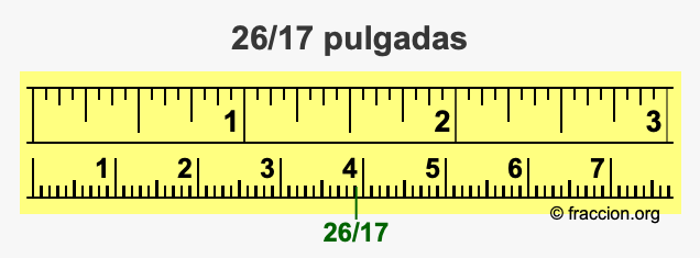 ¿Cómo convertimos 26/17 pulgadas a centímetros (cm)? ¿Cuánto es 26/17 pulgadas en cm? Aquí le mostraremos cómo convertir 26/17 pulgadas a centímetros en forma de fracción, cómo convertir 26/17 pulgadas a centímetros en forma decimal, y también le mostraremos 26/17 pulgadas en una cinta métrica.
