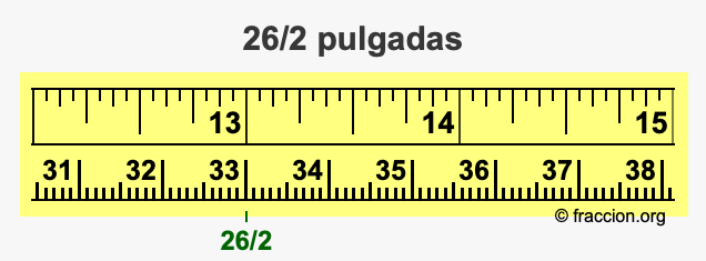 ¿Cómo convertimos 26/2 pulgadas a centímetros (cm)? ¿Cuánto es 26/2 pulgadas en cm? Aquí le mostraremos cómo convertir 26/2 pulgadas a centímetros en forma de fracción, cómo convertir 26/2 pulgadas a centímetros en forma decimal, y también le mostraremos 26/2 pulgadas en una cinta métrica.