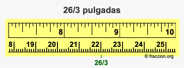 ¿Cómo convertimos 26/3 pulgadas a centímetros (cm)? ¿Cuánto es 26/3 pulgadas en cm? Aquí le mostraremos cómo convertir 26/3 pulgadas a centímetros en forma de fracción, cómo convertir 26/3 pulgadas a centímetros en forma decimal, y también le mostraremos 26/3 pulgadas en una cinta métrica.