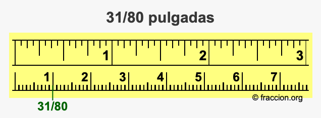 ¿Cómo convertimos 31/80 pulgadas a centímetros (cm)? ¿Cuánto es 31/80 pulgadas en cm? Aquí le mostraremos cómo convertir 31/80 pulgadas a centímetros en forma de fracción, cómo convertir 31/80 pulgadas a centímetros en forma decimal, y también le mostraremos 31/80 pulgadas en una cinta métrica.