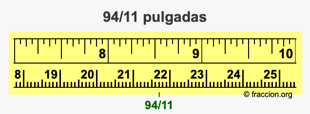 ¿Cómo convertimos 94/11 pulgadas a centímetros (cm)? ¿Cuánto es 94/11 pulgadas en cm? Aquí le mostraremos cómo convertir 94/11 pulgadas a centímetros en forma de fracción, cómo convertir 94/11 pulgadas a centímetros en forma decimal, y también le mostraremos 94/11 pulgadas en una cinta métrica.