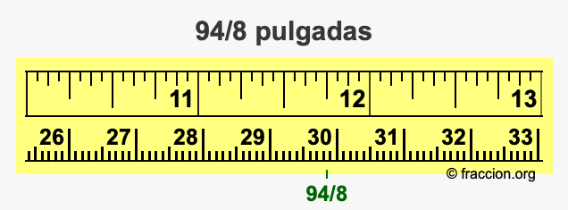 ¿Cómo convertimos 94/8 pulgadas a centímetros (cm)? ¿Cuánto es 94/8 pulgadas en cm? Aquí le mostraremos cómo convertir 94/8 pulgadas a centímetros en forma de fracción, cómo convertir 94/8 pulgadas a centímetros en forma decimal, y también le mostraremos 94/8 pulgadas en una cinta métrica.