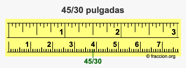 ¿Cómo convertimos 45/30 pulgadas a milímetros (mm)? ¿Cuánto es 45/30 pulgadas en mm? Aquí le mostraremos cómo convertir 45/30 pulgadas a milímetros en forma de fracción, cómo convertir 45/30 pulgadas a milímetros en forma decimal, y también le mostraremos 45/30 pulgadas en una cinta métrica.