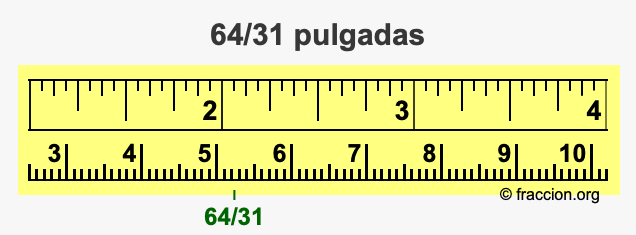 ¿Cómo convertimos 64/31 pulgadas a milímetros (mm)? ¿Cuánto es 64/31 pulgadas en mm? Aquí le mostraremos cómo convertir 64/31 pulgadas a milímetros en forma de fracción, cómo convertir 64/31 pulgadas a milímetros en forma decimal, y también le mostraremos 64/31 pulgadas en una cinta métrica.