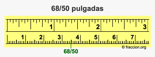 ¿Cómo convertimos 68/50 pulgadas a milímetros (mm)? ¿Cuánto es 68/50 pulgadas en mm? Aquí le mostraremos cómo convertir 68/50 pulgadas a milímetros en forma de fracción, cómo convertir 68/50 pulgadas a milímetros en forma decimal, y también le mostraremos 68/50 pulgadas en una cinta métrica.