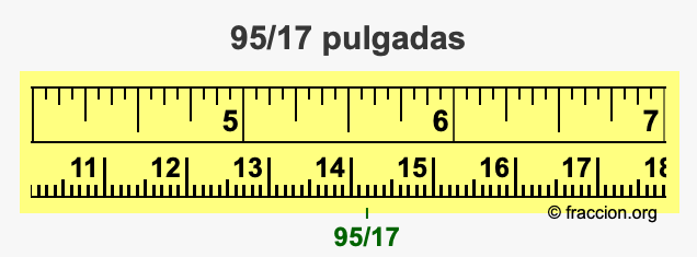 ¿Cómo convertimos 95/17 pulgadas a milímetros (mm)? ¿Cuánto es 95/17 pulgadas en mm? Aquí le mostraremos cómo convertir 95/17 pulgadas a milímetros en forma de fracción, cómo convertir 95/17 pulgadas a milímetros en forma decimal, y también le mostraremos 95/17 pulgadas en una cinta métrica.