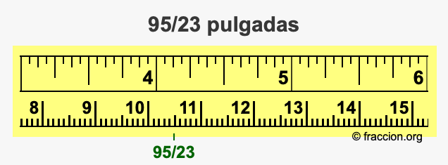 ¿Cómo convertimos 95/23 pulgadas a milímetros (mm)? ¿Cuánto es 95/23 pulgadas en mm? Aquí le mostraremos cómo convertir 95/23 pulgadas a milímetros en forma de fracción, cómo convertir 95/23 pulgadas a milímetros en forma decimal, y también le mostraremos 95/23 pulgadas en una cinta métrica.