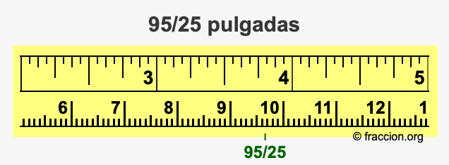 ¿Cómo convertimos 95/25 pulgadas a milímetros (mm)? ¿Cuánto es 95/25 pulgadas en mm? Aquí le mostraremos cómo convertir 95/25 pulgadas a milímetros en forma de fracción, cómo convertir 95/25 pulgadas a milímetros en forma decimal, y también le mostraremos 95/25 pulgadas en una cinta métrica.