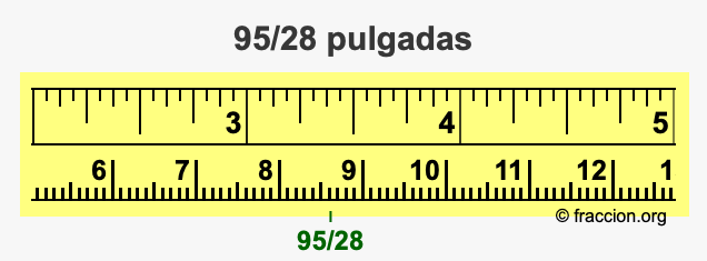 ¿Cómo convertimos 95/28 pulgadas a milímetros (mm)? ¿Cuánto es 95/28 pulgadas en mm? Aquí le mostraremos cómo convertir 95/28 pulgadas a milímetros en forma de fracción, cómo convertir 95/28 pulgadas a milímetros en forma decimal, y también le mostraremos 95/28 pulgadas en una cinta métrica.