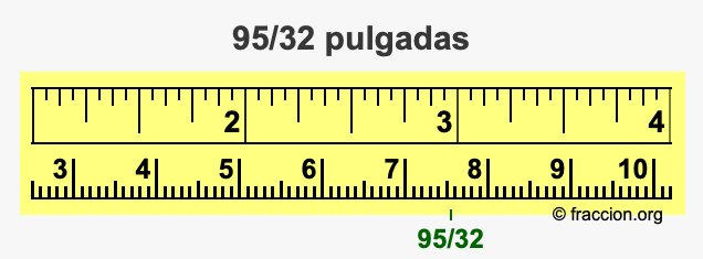 ¿Cómo convertimos 95/32 pulgadas a milímetros (mm)? ¿Cuánto es 95/32 pulgadas en mm? Aquí le mostraremos cómo convertir 95/32 pulgadas a milímetros en forma de fracción, cómo convertir 95/32 pulgadas a milímetros en forma decimal, y también le mostraremos 95/32 pulgadas en una cinta métrica.