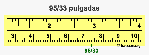 ¿Cómo convertimos 95/33 pulgadas a milímetros (mm)? ¿Cuánto es 95/33 pulgadas en mm? Aquí le mostraremos cómo convertir 95/33 pulgadas a milímetros en forma de fracción, cómo convertir 95/33 pulgadas a milímetros en forma decimal, y también le mostraremos 95/33 pulgadas en una cinta métrica.