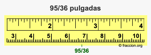 ¿Cómo convertimos 95/36 pulgadas a milímetros (mm)? ¿Cuánto es 95/36 pulgadas en mm? Aquí le mostraremos cómo convertir 95/36 pulgadas a milímetros en forma de fracción, cómo convertir 95/36 pulgadas a milímetros en forma decimal, y también le mostraremos 95/36 pulgadas en una cinta métrica.
