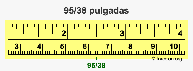 ¿Cómo convertimos 95/38 pulgadas a milímetros (mm)? ¿Cuánto es 95/38 pulgadas en mm? Aquí le mostraremos cómo convertir 95/38 pulgadas a milímetros en forma de fracción, cómo convertir 95/38 pulgadas a milímetros en forma decimal, y también le mostraremos 95/38 pulgadas en una cinta métrica.