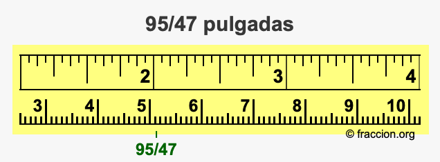 ¿Cómo convertimos 95/47 pulgadas a milímetros (mm)? ¿Cuánto es 95/47 pulgadas en mm? Aquí le mostraremos cómo convertir 95/47 pulgadas a milímetros en forma de fracción, cómo convertir 95/47 pulgadas a milímetros en forma decimal, y también le mostraremos 95/47 pulgadas en una cinta métrica.