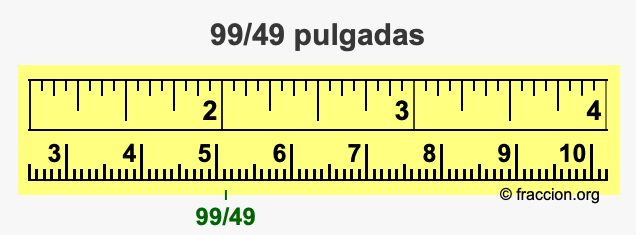 ¿Cómo convertimos 99/49 pulgadas a milímetros (mm)? ¿Cuánto es 99/49 pulgadas en mm? Aquí le mostraremos cómo convertir 99/49 pulgadas a milímetros en forma de fracción, cómo convertir 99/49 pulgadas a milímetros en forma decimal, y también le mostraremos 99/49 pulgadas en una cinta métrica.