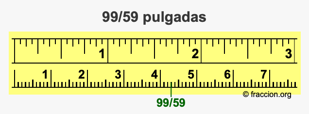 ¿Cómo convertimos 99/59 pulgadas a milímetros (mm)? ¿Cuánto es 99/59 pulgadas en mm? Aquí le mostraremos cómo convertir 99/59 pulgadas a milímetros en forma de fracción, cómo convertir 99/59 pulgadas a milímetros en forma decimal, y también le mostraremos 99/59 pulgadas en una cinta métrica.