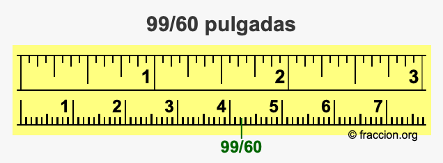 ¿Cómo convertimos 99/60 pulgadas a milímetros (mm)? ¿Cuánto es 99/60 pulgadas en mm? Aquí le mostraremos cómo convertir 99/60 pulgadas a milímetros en forma de fracción, cómo convertir 99/60 pulgadas a milímetros en forma decimal, y también le mostraremos 99/60 pulgadas en una cinta métrica.